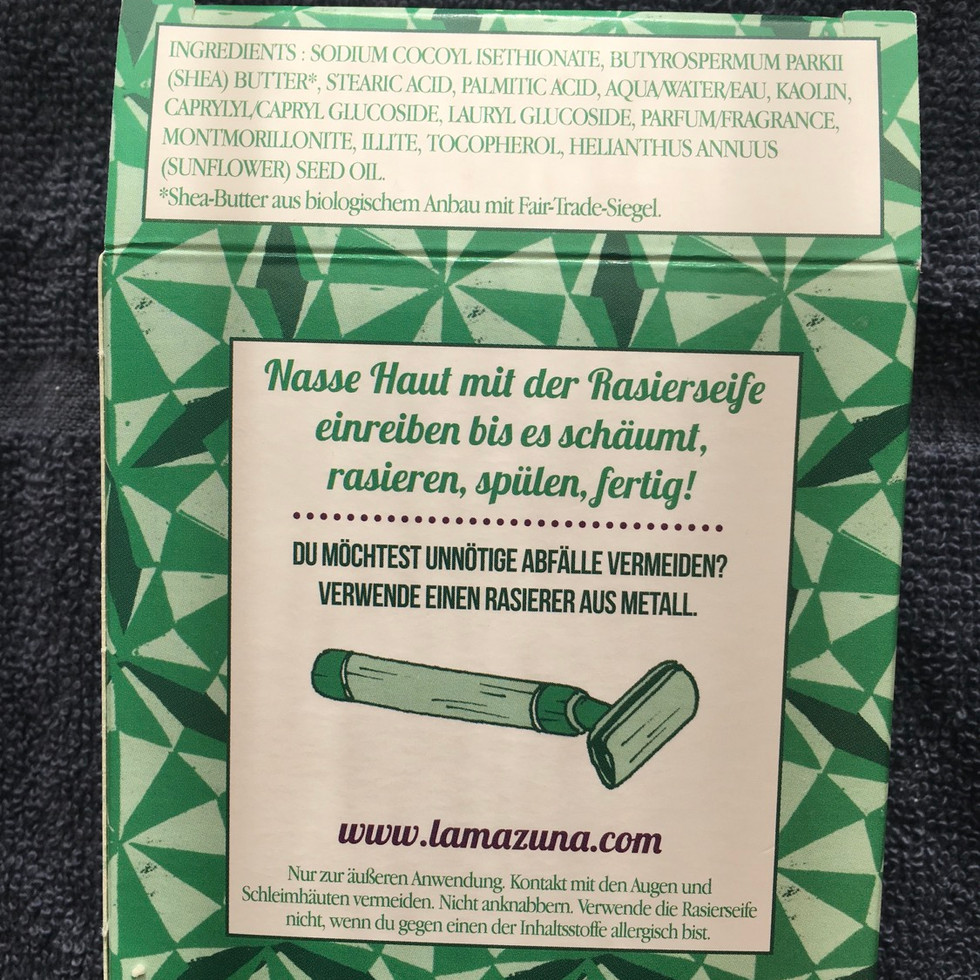 Bezüglich ihrer Verpackung nachhaltig ist auch die Rasierseife vom deutschen Hersteller Lamazuna. Die vegane Seife lässt sich für das Scheren des Männerbart oder der Frauenbeine ganz einfach mit etwas Wasser aufschäumen. Was mir dabei weniger zusagt, ist, dass auch für diese Rezeptur Palmöl verwendet wird. Wobei bedacht werden muss, dass herkömmlicher Rasierschaum auch Palmöl auskommt.